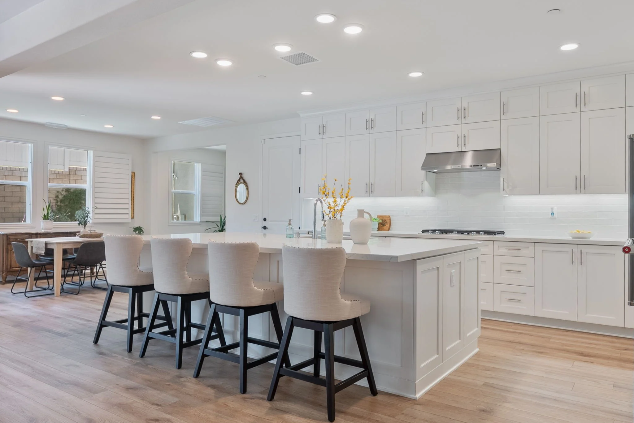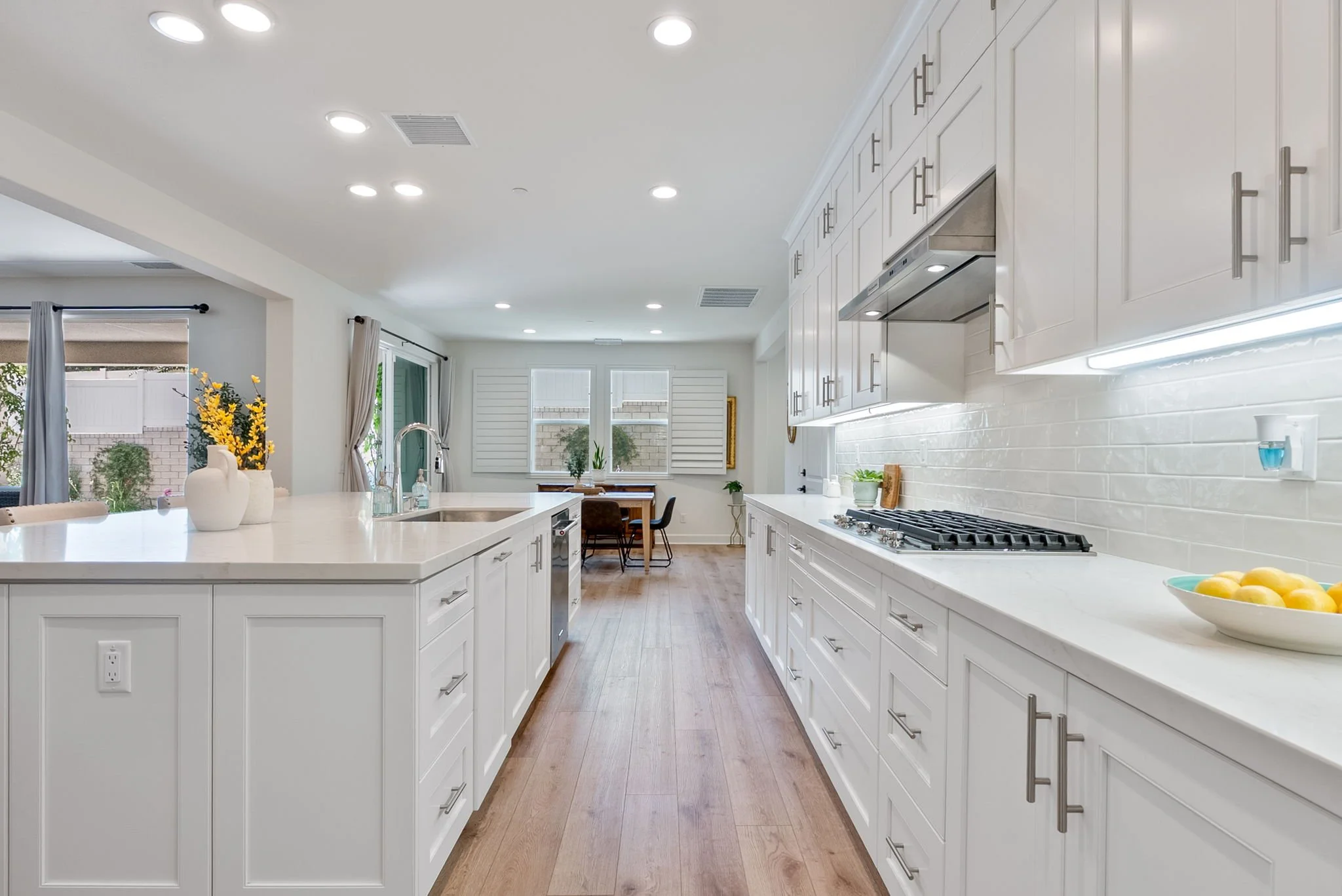 The chef's kitchen boasts sleek quartz countertops, high-end finishes, and a seamless flow to the great room - perfect for hosting gatherings. Outdoors, enjoy the California lifestyle under a covered patio with a built-in fireplace - ideal for year-round entertaining - framed by a lushly landscaped oversized lot.